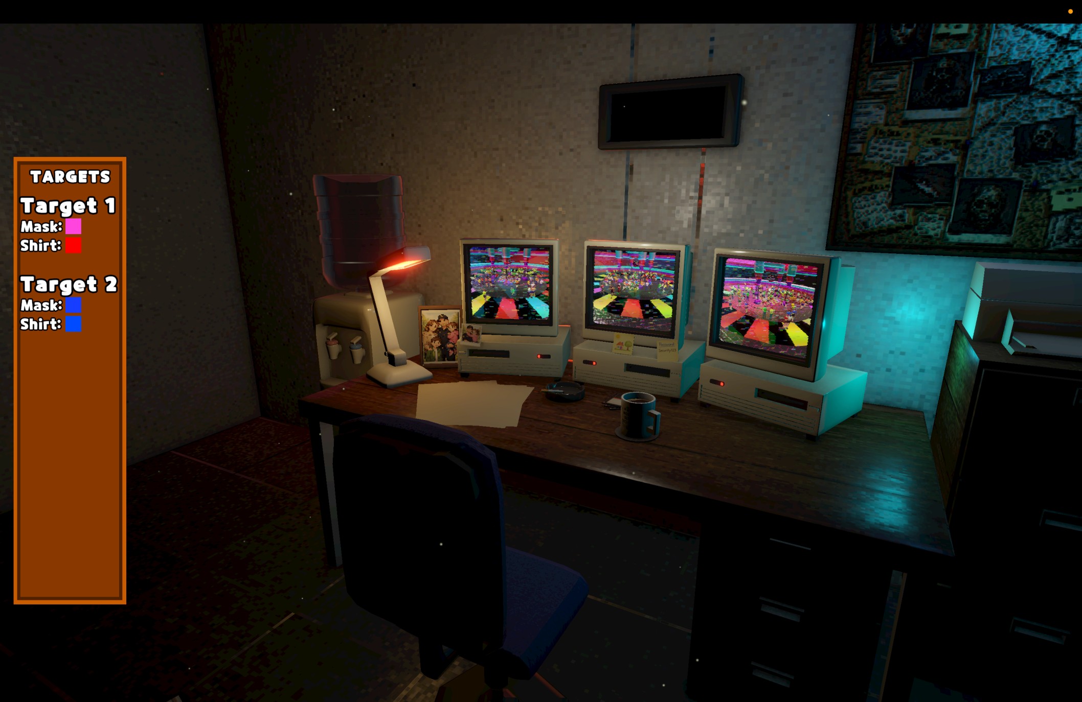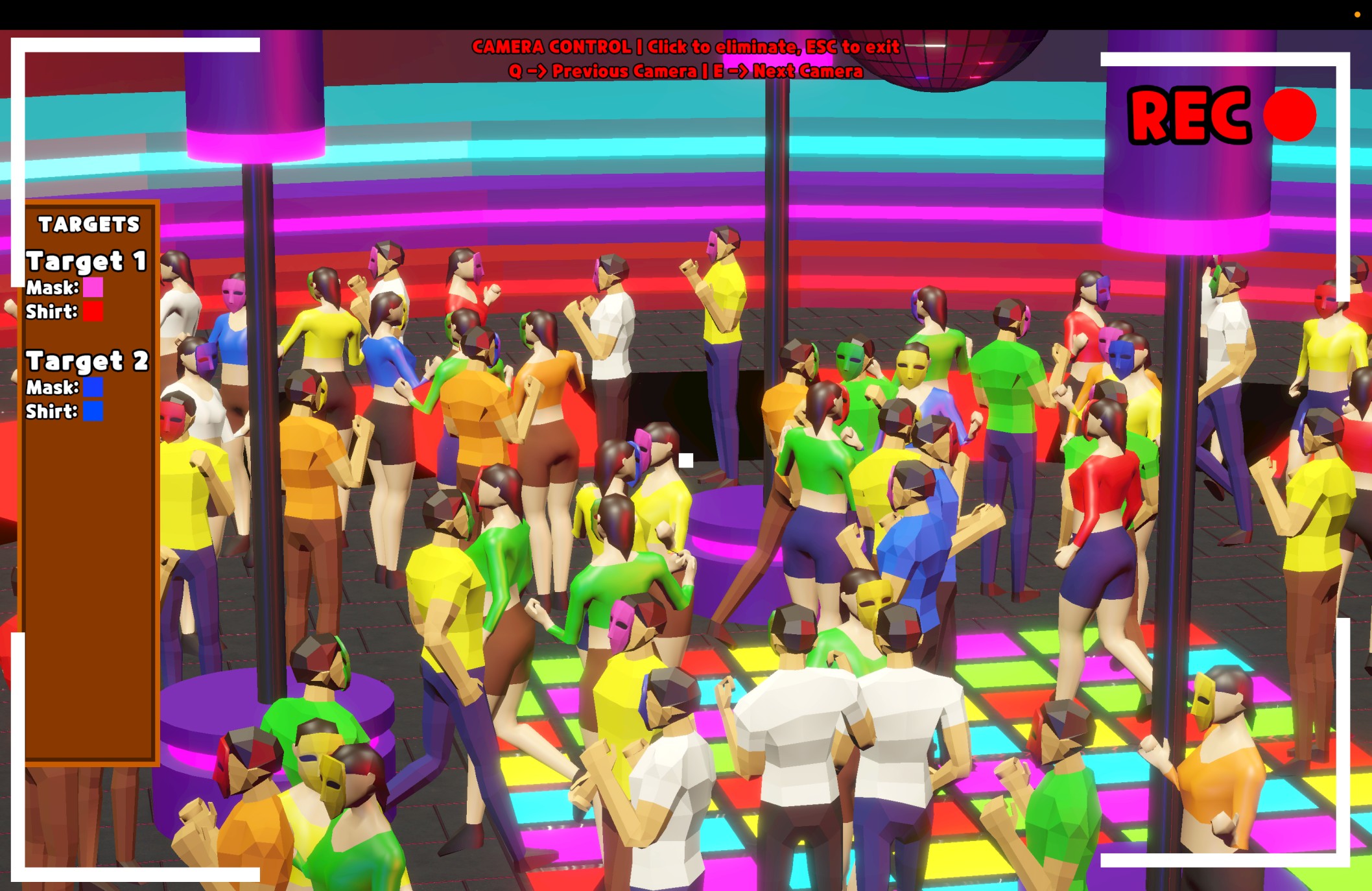 A tense surveillance assassination game where you operate security cameras at an exclusive masked party. Your targets are hidden among the guests—identified only by their masks and clothing. Watch. Wait. Aim.